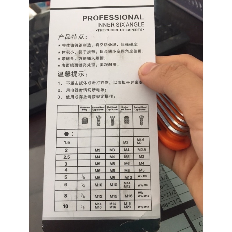- Vì được làm từ chất liệu cao cấp nên cho khả năng chống ăn mòn, không bị gỉ sét giúp sử dụng bền lâu, kéo dài tuổi thọ giúp bạn có thể thoải mái làm việc ở nhiều điều kiện môi trường khác nhau mà không lo ngại sản phẩm bị Ôxy hoá hay mài mòn. Ngoài ra, đảm bảo trong quá trình làm việc lục giác không làm trầy xước bề mặt khác. - Bộ bao gồm 8 món với các kích thước khác nhau: 1.5mm, 2mm, 2.5mm, 3mm, 4mm, 5mm, 6mm, 8mm phù hợp với từng bulong, ốc vít. Giúp bạn có thể linh hoạt hơn trong công việc.