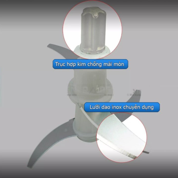 Sản phẩm được tích hợp bộ lưỡi dao kép (4 lưỡi) thông minh và độc đáo kết hợp chất liệu thép không gỉ tạo nên lực cắt mạnh & độ sắc bén nhanh chóng xay thực phẩm nhuyễn chỉ trong thời gian ngắn. Hơn thế nữa, trục lưỡi dao là thép bọc nhựa khó bị tét như các trục lưỡi thuần nhựa. Ngoài ra, lưỡi dao thiết kế rời có thể tháo rời dễ dàng để vệ sinh chi tiết.