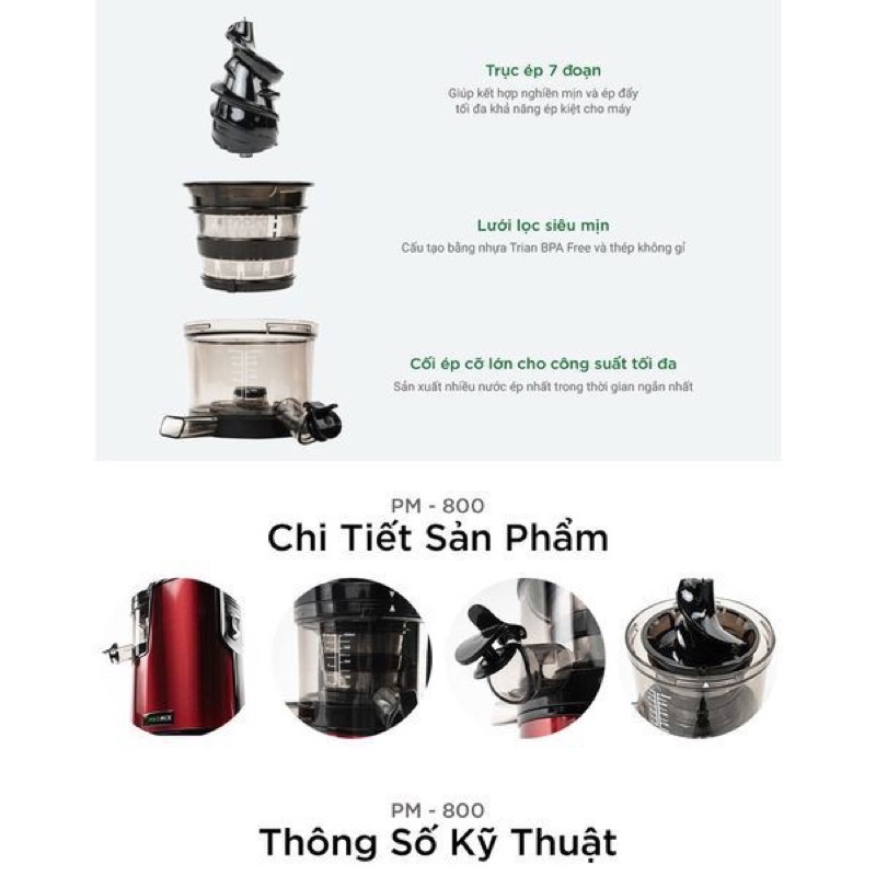 Máy ép hoa quả chậm Promix PM-800, Tea Shop TS-400 có tính linh hoạt cao với ba bộ lọc nước ép bằng nhựa Tritan không chứa chất độc hại BPA. Bộ lọc mịn cho phép bạn tạo ra một chất lượng đồng nhất cho nước ép với tỷ lệ bã thấp nhất và khô nhất.