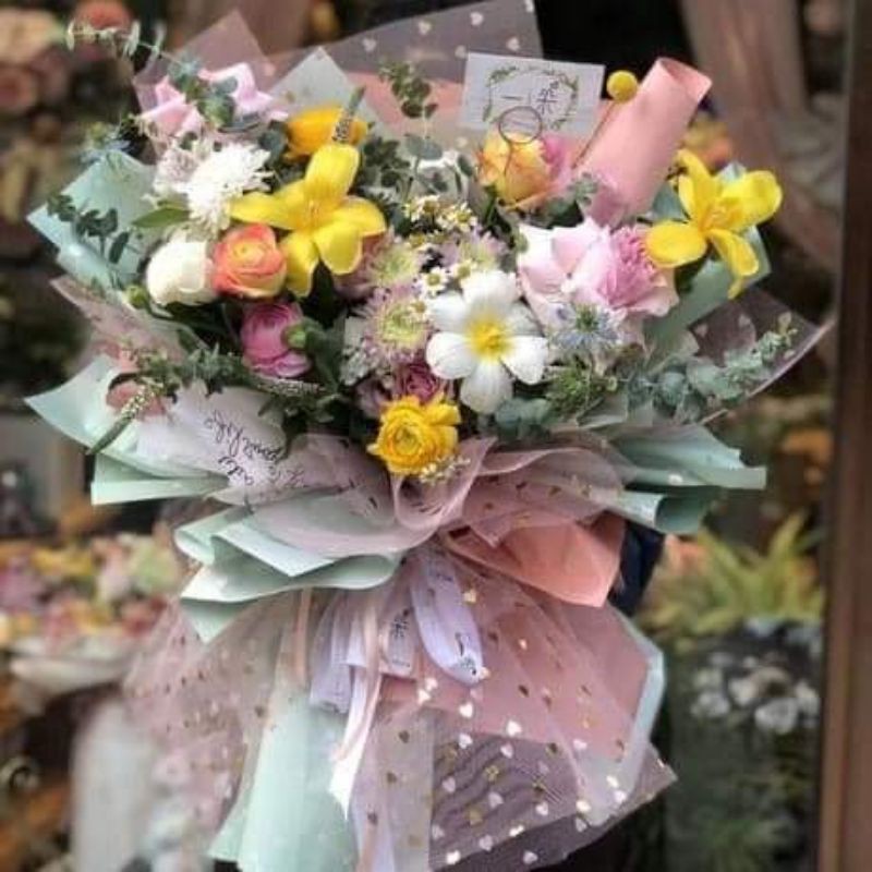 Chất liệu voan lưới mỏng nhẹ in hình trái tim , trái tim kim tuyến màu vàng.....Thích hợp bó hoa .trang trí phụ kiện trang trí.....