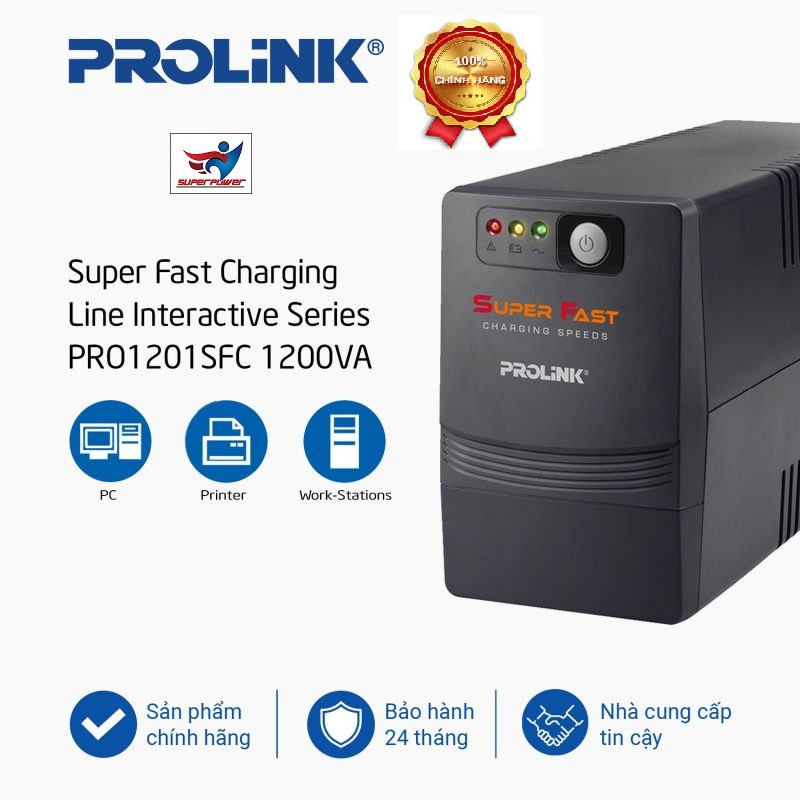 UPS PROLINK SFC là hệ thống UPS Line Interactive vào 1 pha/ra 1 pha sử dụng Công nghệ nạp sạc siêu nhanh. Công nghệ có lợi thế vượt trội này có thể nạp sạc lại cho Ăc quy dự phòng 90% dung lượng chỉ trong vòng 2-4 giờ, rất lý tưởng cho việc cung cấp nguồn dự phòng ổn định cho các thiết bị gia đình, văn phòng như PC, máy in, Workstation,... Dòng UPS này có dãi điện áp vào rộng nhờ tích hợp bộ AVR 3 bước mà tính chất cơ bản của nó là "2 boots and 1 buck" để ổn định điện áp đầu ra, nhờ đó tránh được các hiện tượng hạ áp hoặc quá áp. Thiết bị này cũng cung cấp nhiều khe cắm đa năng tạo ra khả năng tương thích hợp với dãi các thiết bị phụ tải đa dạng hơn.Tích hợp bộ sạc siêu nhanh, nhờ đó ắc quy có thể nạp sạc được 90% dung lượng của nó trong khoảng 2-4 giờ.