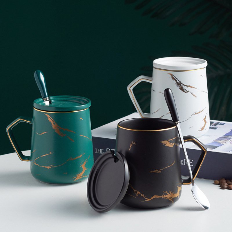 Ly Sứ Uống Trà Cà Phê Vân Đá Có Nắp Đậy Tặng Muỗng, Bộ Cốc Đánh Răng Đựng Bàn Chải Decor Phòng Tắm Cao Cấp