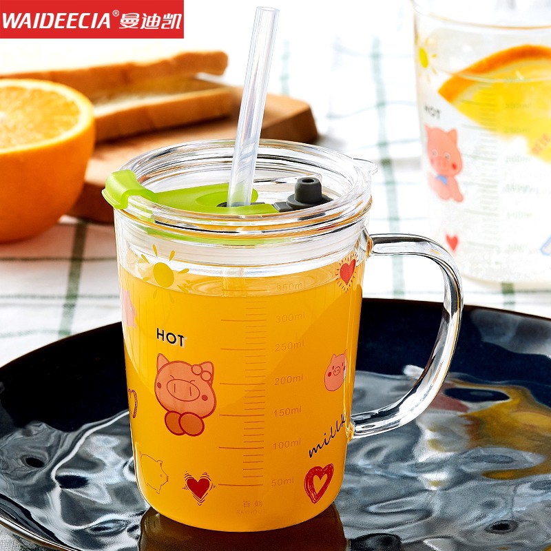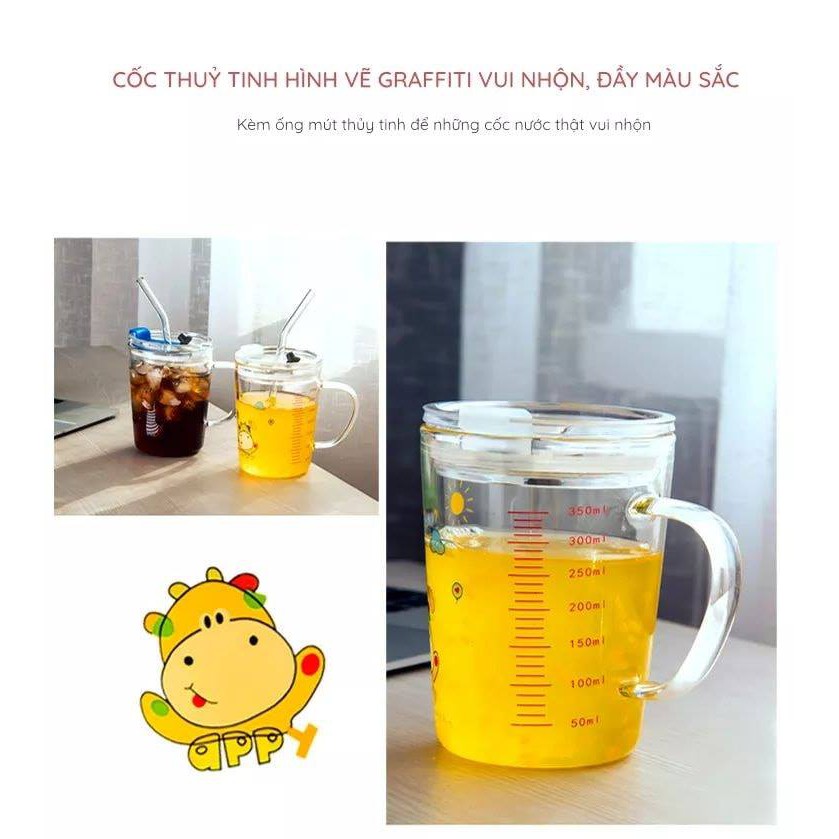 ly thủy tinh pha sữa - có vạch đo thể tích 350ml, có nắp đậy, ống hút silicon đi kèm- tặng kèm thìa khuấy sữa