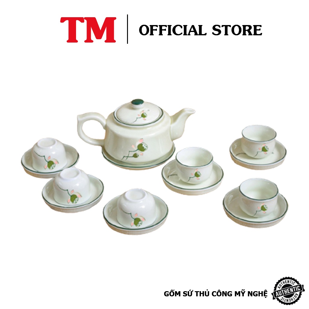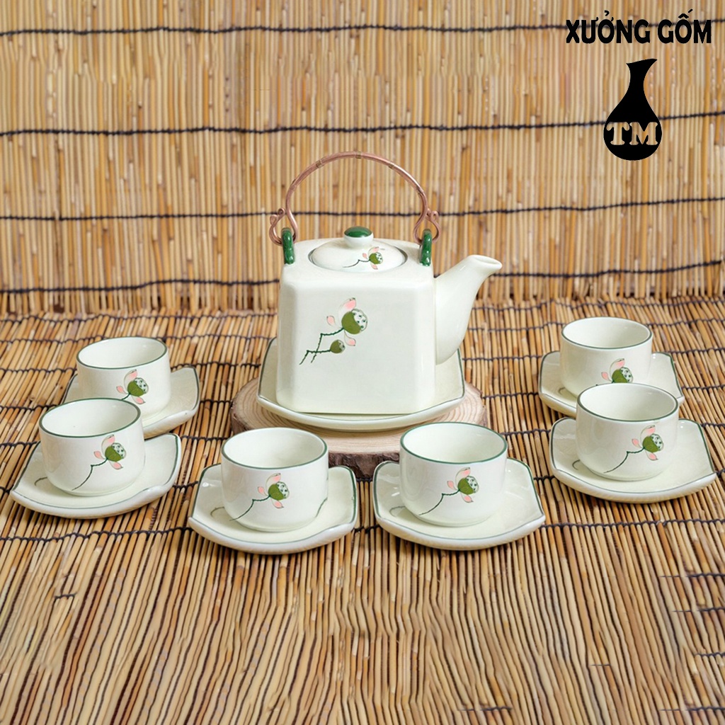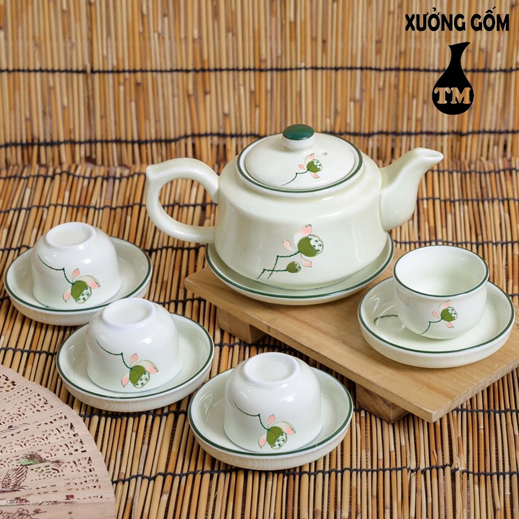 Bộ Ấm Pha Trà Men Kem Họa Tiết Vẽ Đài Sen Xưởng Gốm TM Bát Tràng( bộ bình trà, uống trà)