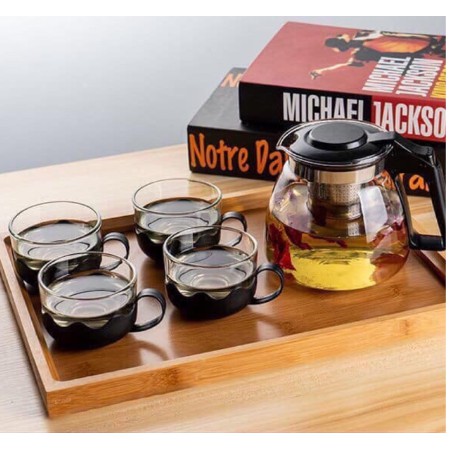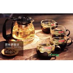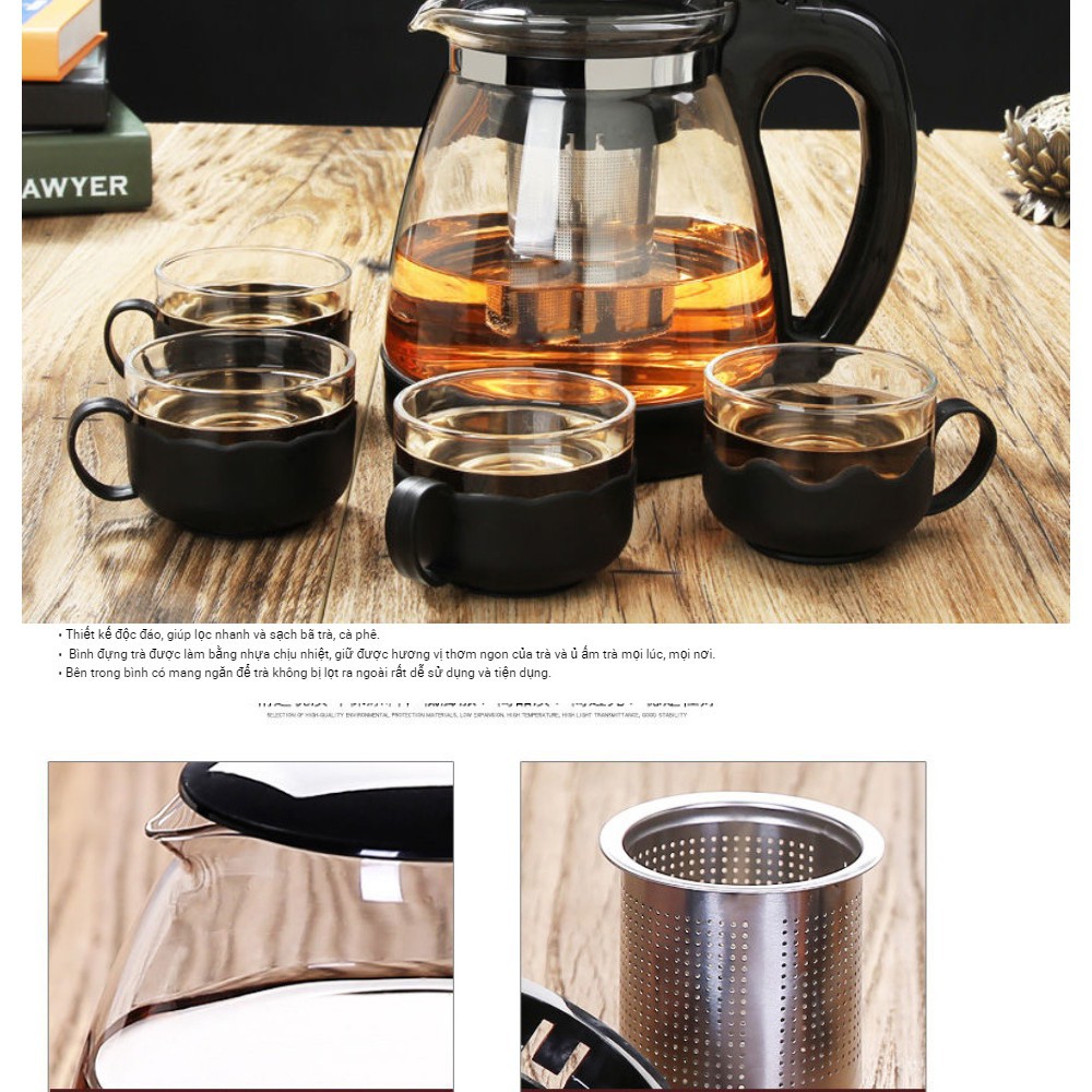 - Chất liệu: Bình trà thủy tinh chịu nhiệt độ cao . Lưới lọc trà bằng inox 304 cao cấp chống gỉ sét . 4 tách trà