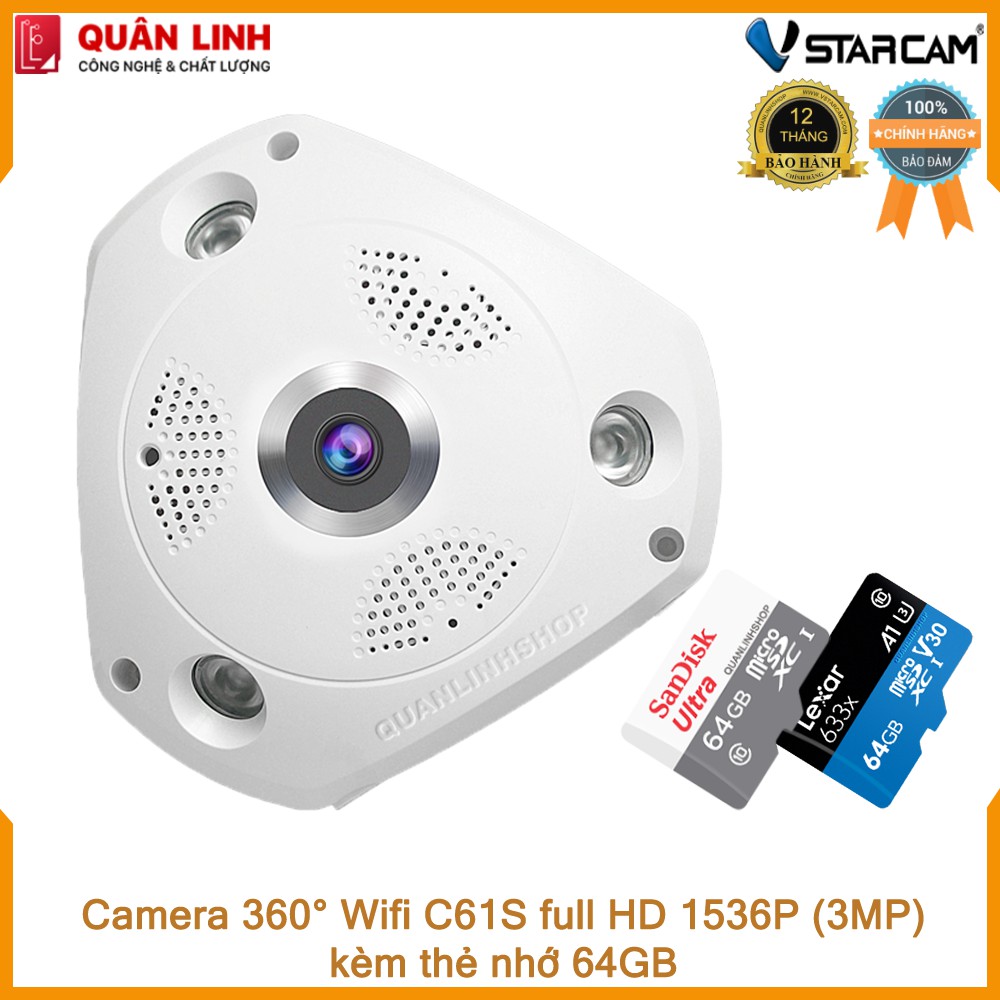 Camera Wifi IP Vstarcam C61s Full HD 1536P ốp trần, góc rộng 180 độ kèm thẻ 64GB