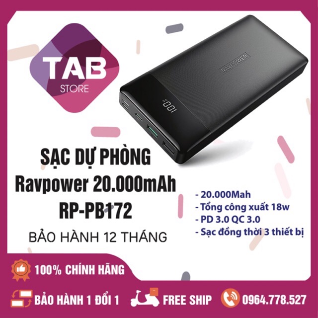 Điện Thoại & Phụ Kiện > Pin sạc dự phòng > 10000 - 20000mAh || Sạc Dự Phòng Ravpower RP-PB172 - 20000mah - Chính Hãng (Pd 18W - Qc3.0)Còn hàng