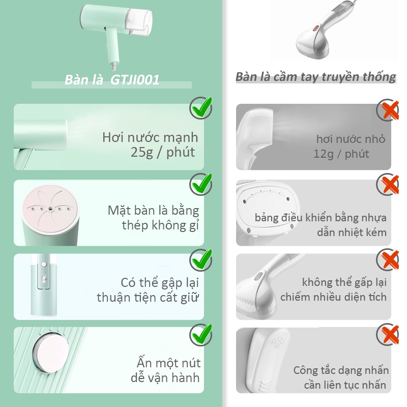- Mặt bàn là bằng thép không gỉ có thể gập lại, nhỏ và di động / 10 giây hơi nước.