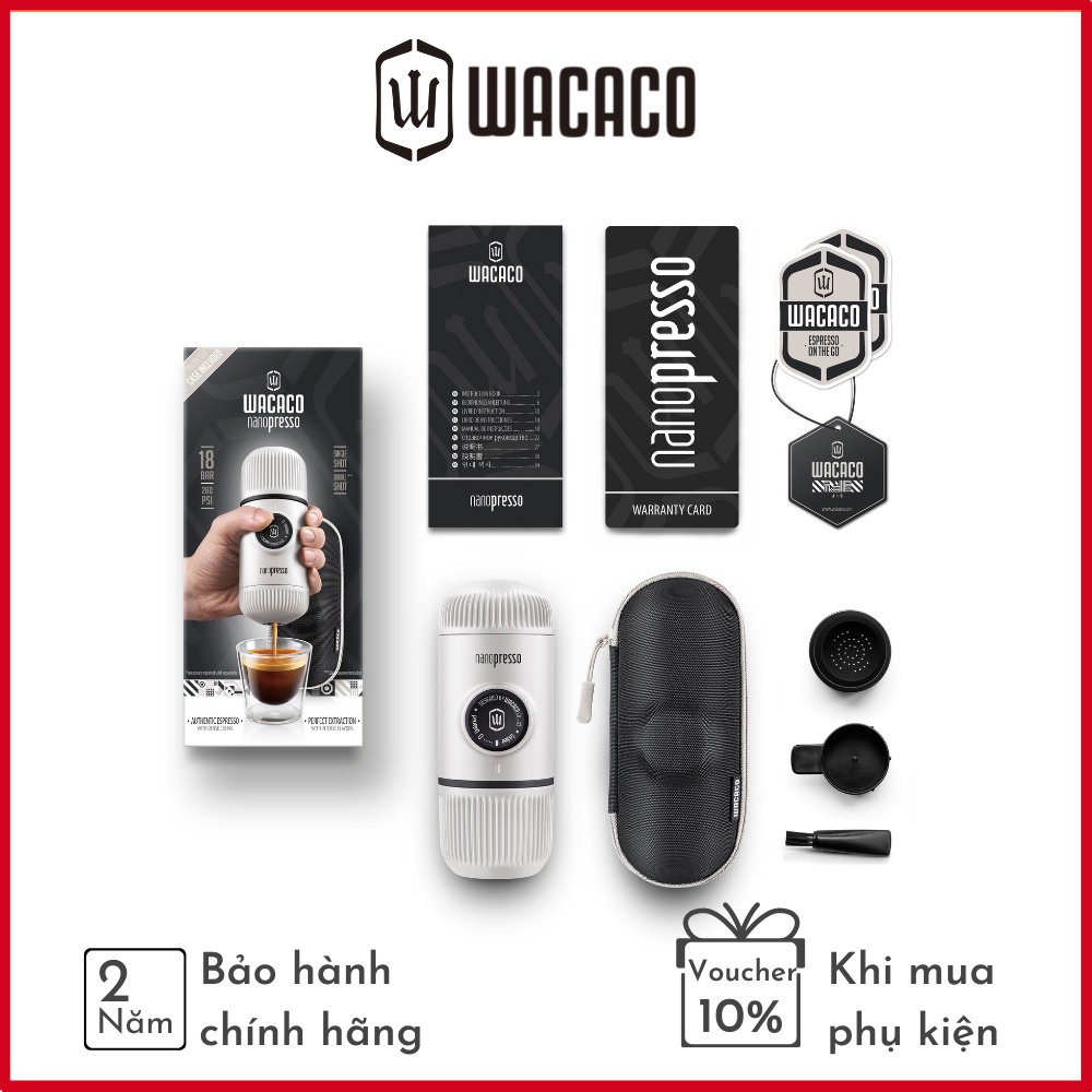 Bộ sản phẩm bao gồm: Nanopresso, tách espresso tích hợp, giỏ lọc, muỗng, bàn chải, túi đựng, thẻ bảo hành, nhãn dán và sách hướng dẫn đa ngôn ngữ.