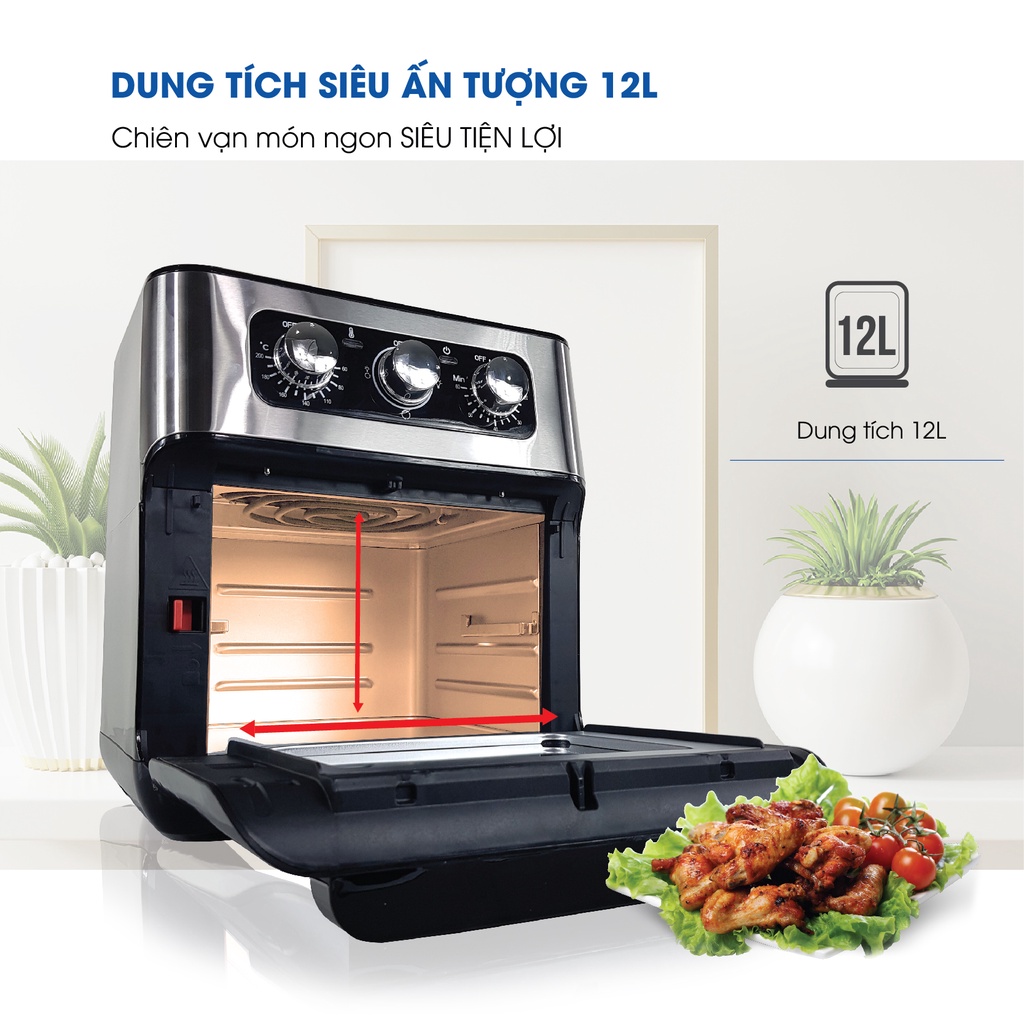 - Dung tích siêu khủng lên tới 12L, khoang nướng rộng giúp người dùng có thể chế biến lượng lớn thực phẩm và đa dạng các món ăn trong một mẻ vô cùng tiện lợi và tiết kiệm.