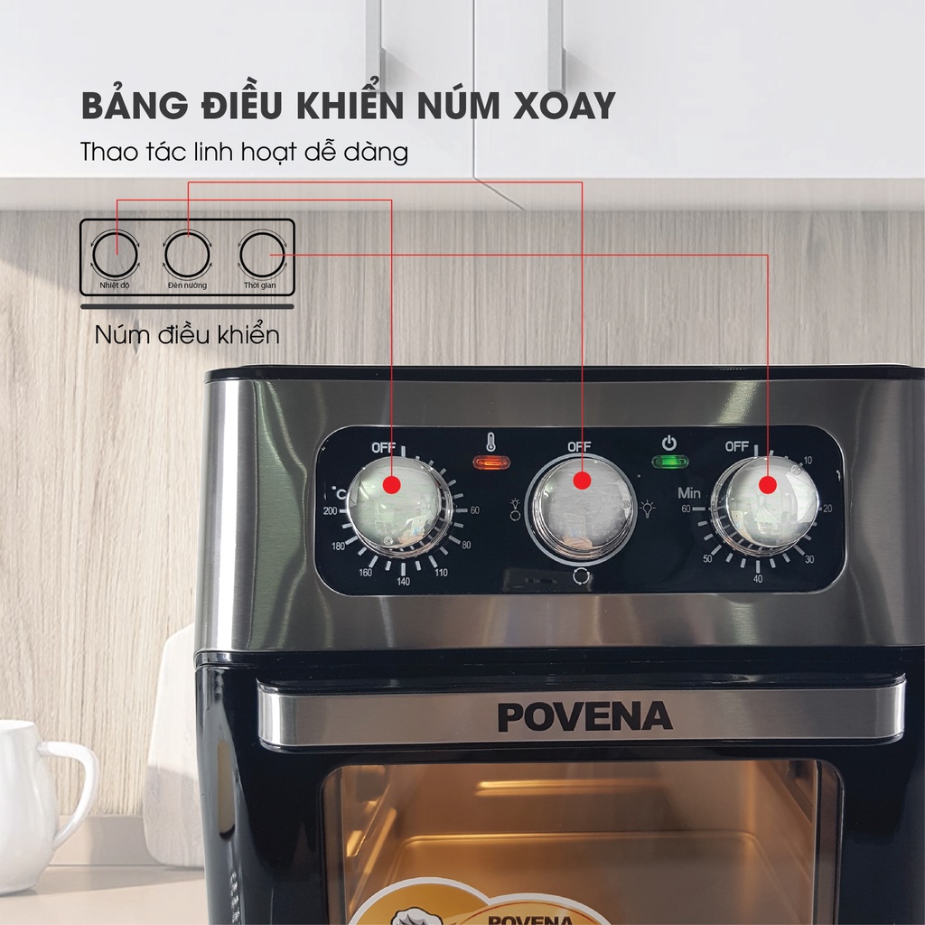 - Nồi nướng không dầu 12l Povena PVN-3612 tùy chỉnh mức nhiệt từ 80-200 độ C, chế độ hẹn giờ tối đa 60 phút, điều khiển bằng núm xoay đơn giản, đáp ứng nhu cầu chiên nướng các loại thực phẩm khác nhau của người sử dụng.