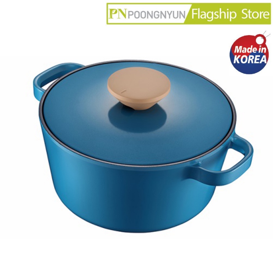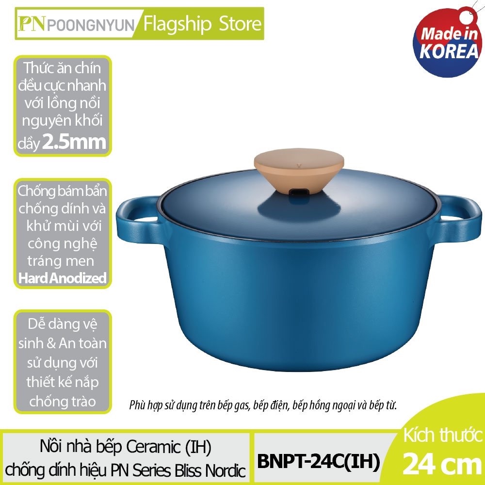 Nồi nhà bếp (loại nồi casserole size lớn) Ceramic từ tính cao cấp hiệu PoongNyun Series Bliss Nordic 3 lớp dầy 2.5mm chống dính, chống trầy xước màu xanh Ocean Blue với công nghệ tráng men hiện “Hard Anodized” không tróc men, chống gỉ sét, chống ăn mòn, giữ và gia nhiệt lâu hơn giúp thức ăn mau chín tiết kiệm thời gian và nhiên liệu, thiết kế nắp chống trào, tay cầm dài chống nóng, sử dụng trên bếp gas, bếp hồng ngoại, bếp từ, gồm 02 món (1 nồi và 1 nắp ceramic 24cm).• Xuất xứ thương hiệu: Hàn Quốc • Sản xuất tại: Made in Korea • Đường kính đáy : 24cm