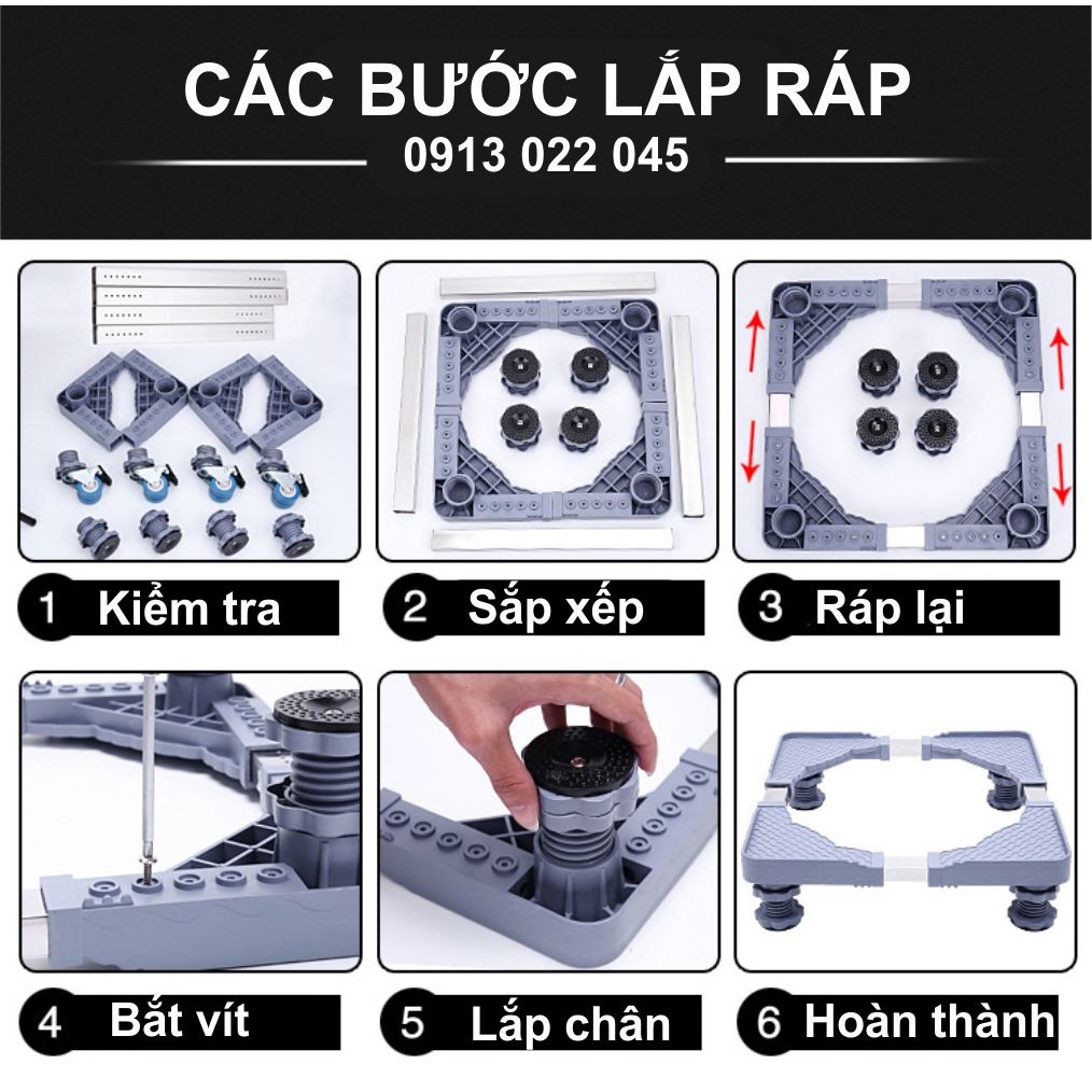 Chân đế có thể thay đổi được cả chiều dài và chiều rộng từ 45-65cm tùy theo kích thước máy giặt, tủ lạnh.