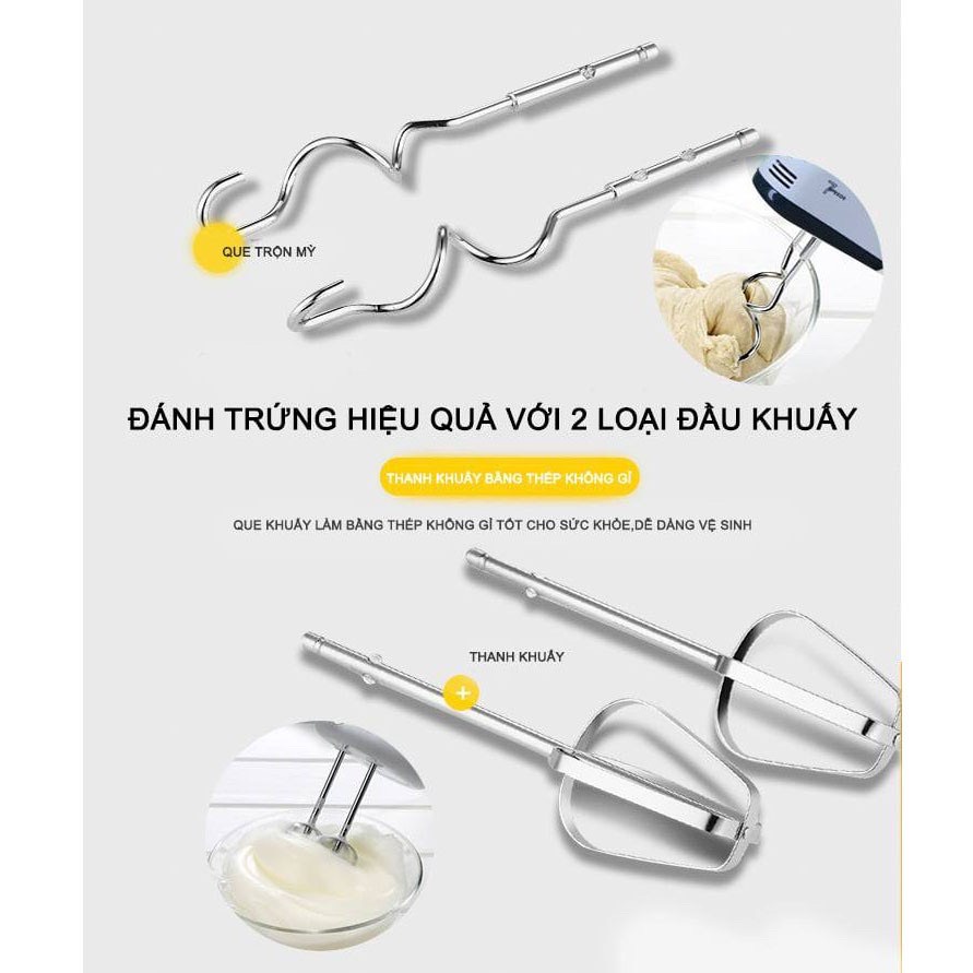 Máy máy đánh trứng, đánh kem bơ cầm tay, máy làm bánh đi kèm với 2 thanh đánh trứng 4 cạnh, và 2 que xoắn để nhào bột hoặc trộn salad.