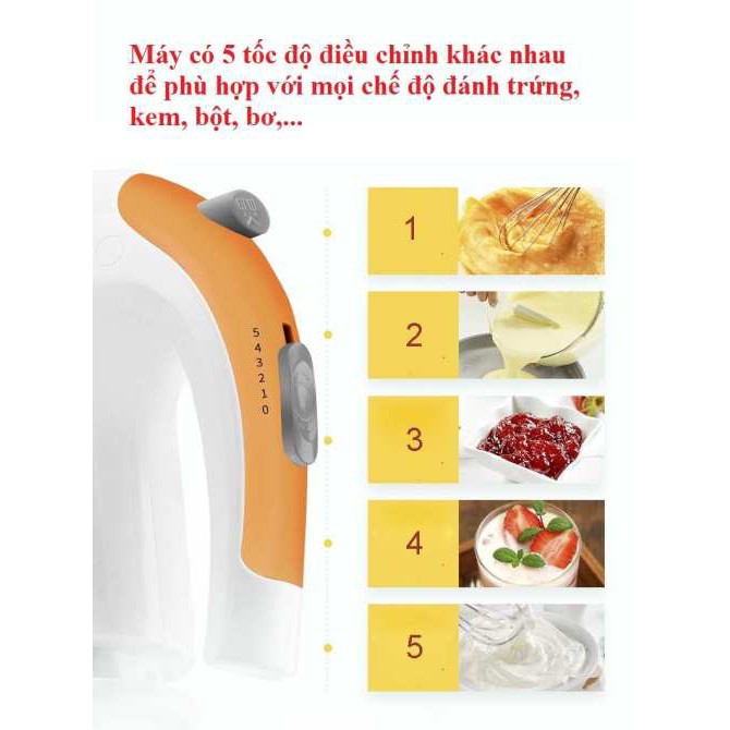 - Máy đánh trứng với 5 tốc độ quay và nút tăng cường giúp đánh trứng và trộn bột nhanh hơn