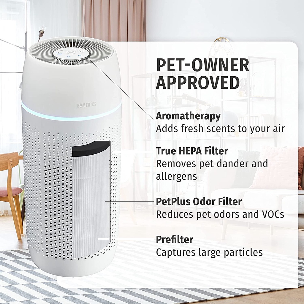 HoMedics AP-PET35A-WT một chiếc máy lọc không khí chuyên dụng cho những gia đình có vật nuôi. Bộ lọc của thiết bị này có thêm một lớp màng lọc chuyên dụng để loại bỏ lông thú cưng, mùi hộp rác, mùi lông hoặc phân động vật. 5 tính năng độc đáo được tích hợp trên chiếc máy lọc không khí cỡ lớn này.– Bộ lọc trụ Hepa 360 độ: Công nghệ lọc không khí bằng lõi lọc Hepa được áp dụng nhiều trên các máy lọc không khí cao cấp, tuy nhiên hầu hêt các máy sử dụng bộ lọc Hepa phẳng nên chỉ chút khống khí bẩn từ một chiều chiều còn lại cho ra không khí sạch, việc này khiến quá trình lọc không khí diễn ra lâu hơn, mật độ không khí sạch cũng không đều. Màng lọc Hepa 360 độ cho phép hút không khí bẩn từ mọi hướng trong căn phòng và thổi luồng không khí sạch lên phía trên. Không khí bẩn đặc tính là nặng hơn không khí sạch vì thế sẽ có xu hướng chìm xuống dưới vì thế quá trình lọc không khí sẽ diễn ra rất nhanh chóng, mật độ không khí sạch cũng đồng đều.