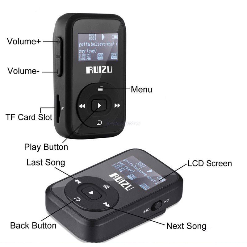 Máy nghe nhạc Ruizu X26 (8GB-Bluetooth) có kẹp áo tương tự như bản chuyên thể thao X55 tước đây nhưng có phần rút gọn về một số tính năng phụ hơn.
