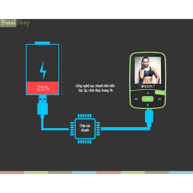 - Được trang bị chip sạc nhanh, chỉ với 5p sạc, bạn có thể sử dụng máy trong 3 giờ nghe nhạc liên tuc (với tai nghe và màn hình độ sáng tối thiểu).
