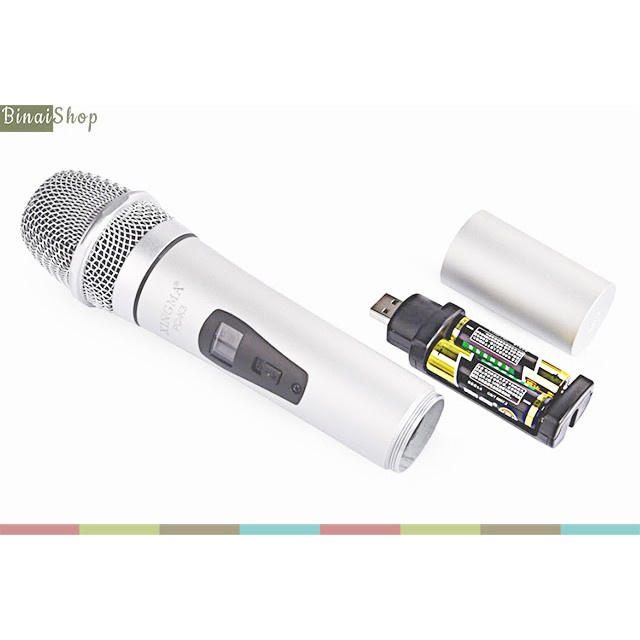 - Sử dụng 2 pin AA cho mic và 2 pin AAA cho bộ thu tín hiệu.