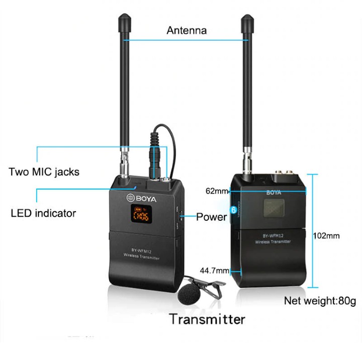 - BỘ MICRO KHÔNG DÂY BOYA BY-WFM12 ĐƯỢC TRANG BỊ SÓNG VHF DẢI TẦN RIÊNG VỚI 12 KÊNH SÓNG, CHO KHẢ NĂNG ỔN ĐỊNH TÍN HIỆU CAO, KHÔNG BỊ LẪN SÓNG HOẶC SUY HAO TÍN HIỆU.