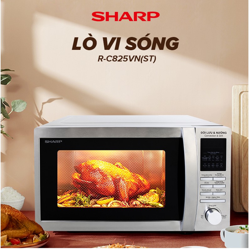 • Lò vi sóng Sharp R-C825VN(ST) 25 lít, bảng điều khiển điện tử Anh – Việt• Công suất 900W/ Đối lưu nhiệt 2400W/ Nướng 1400W
