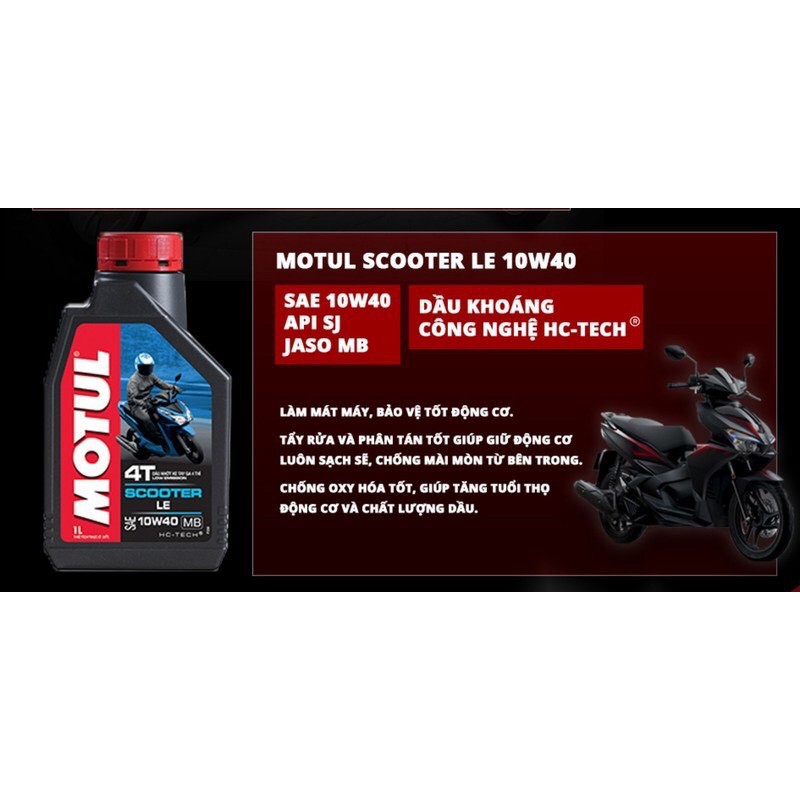 - Motul Scooter LE 10W40 đến từ hãng dầu nhớt Motul danh tiếng tại Pháp, là sản phẩm dầu nhớt đặc biệt dành cho xe tay ga 4 thì đời mới. Motul Scooter LE 10W40 tự hào được nhiều nhà sản xuất xe khuyến cáo nên dùng cho các động cơ xe tay ga mới hiện nay.