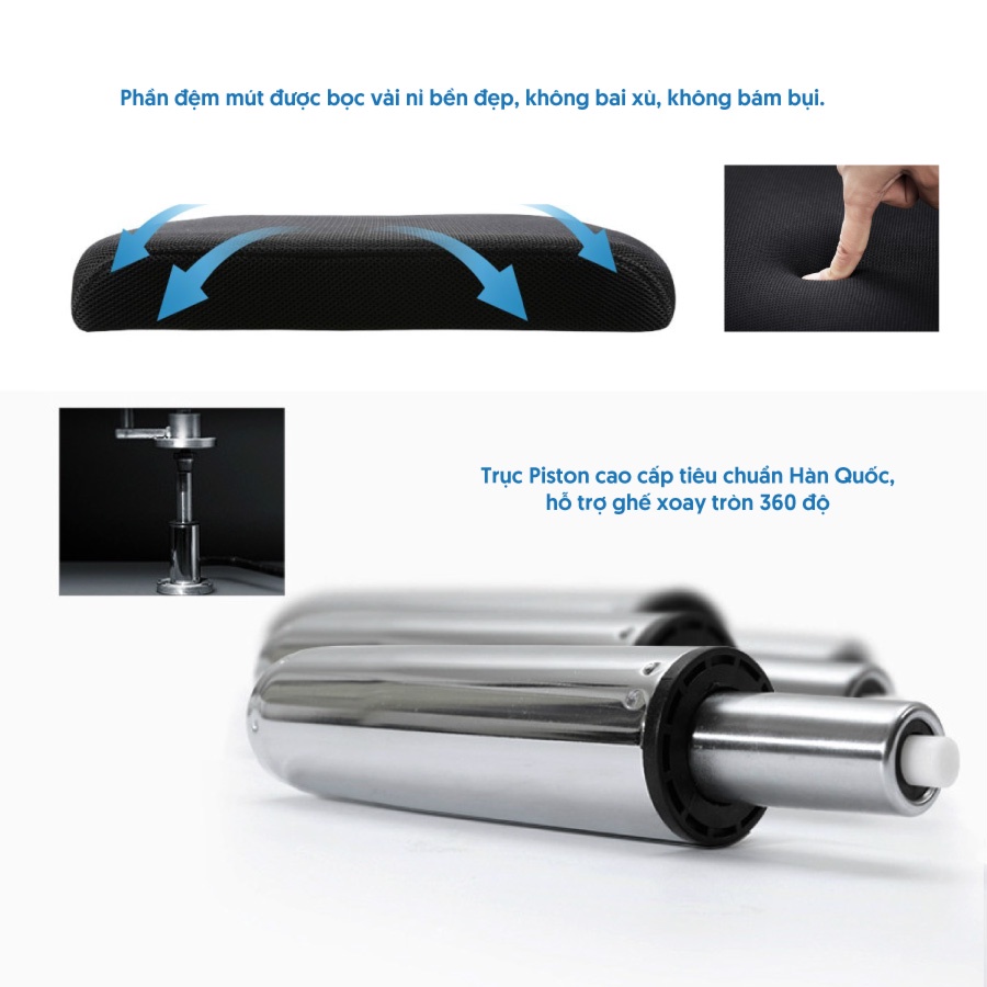 + Khung lưng bằng nhựa nylon PA. Tựa lưng bọc vải lưới cao cấp. Đệm nhựa đỡ thắt lưng có thể điều chỉnh cao thấp, ôm sát lưng người ngồi. Tặng kèm đệm mút rời đỡ thắt lưng.