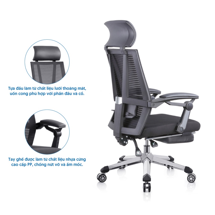 + Tựa tay bằng nhựa PA bọc da PU êm ái, điều chỉnh ngả đồng bộ với lưng ghế.