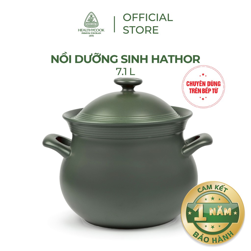 Nồi sứ dưỡng sinh Minh Long 7.1 L Hathor - bếp từ là sản phẩm chuyên dùng cho bếp từ thuộc bộ sưu tập Nồi sứ dưỡng sinh HealthyCook của thương hiệu Gốm sứ cao cấp Minh Long I.Nồi được làm từ chất liệu đất hiếm thiên nhiên, an toàn và lành tính tuyệt đối. Đặc biệt, nồi sở hữu chất men trơ không phản ứng với kiềm hoặc axit (thường có trong thực phẩm). Do đó, nồi không bị bong tróc hoặc nổ men dù được kho nấu thường xuyên. Nhờ bước sóng hồng ngoại được tăng cường, thời gian kho nhanh mà thực phẩm vẫn chín đều, chín sâu, màu sắc đẹp. Các chất dinh dưỡng được giữ lại một cách tuyệt đối, hương vị thơm ngon, kích thích vị giác và giúp sản sinh enzyme tốt cho cơ thể.