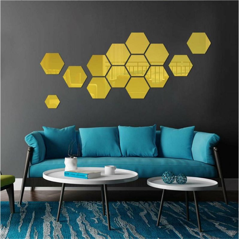 - 1 set 12 cái- Gương dán tường acrylic 3D hình lục giác dùng trang trí phòng khách, phòng ngủ, lối đi, cầu thang, tủ quần áo ...