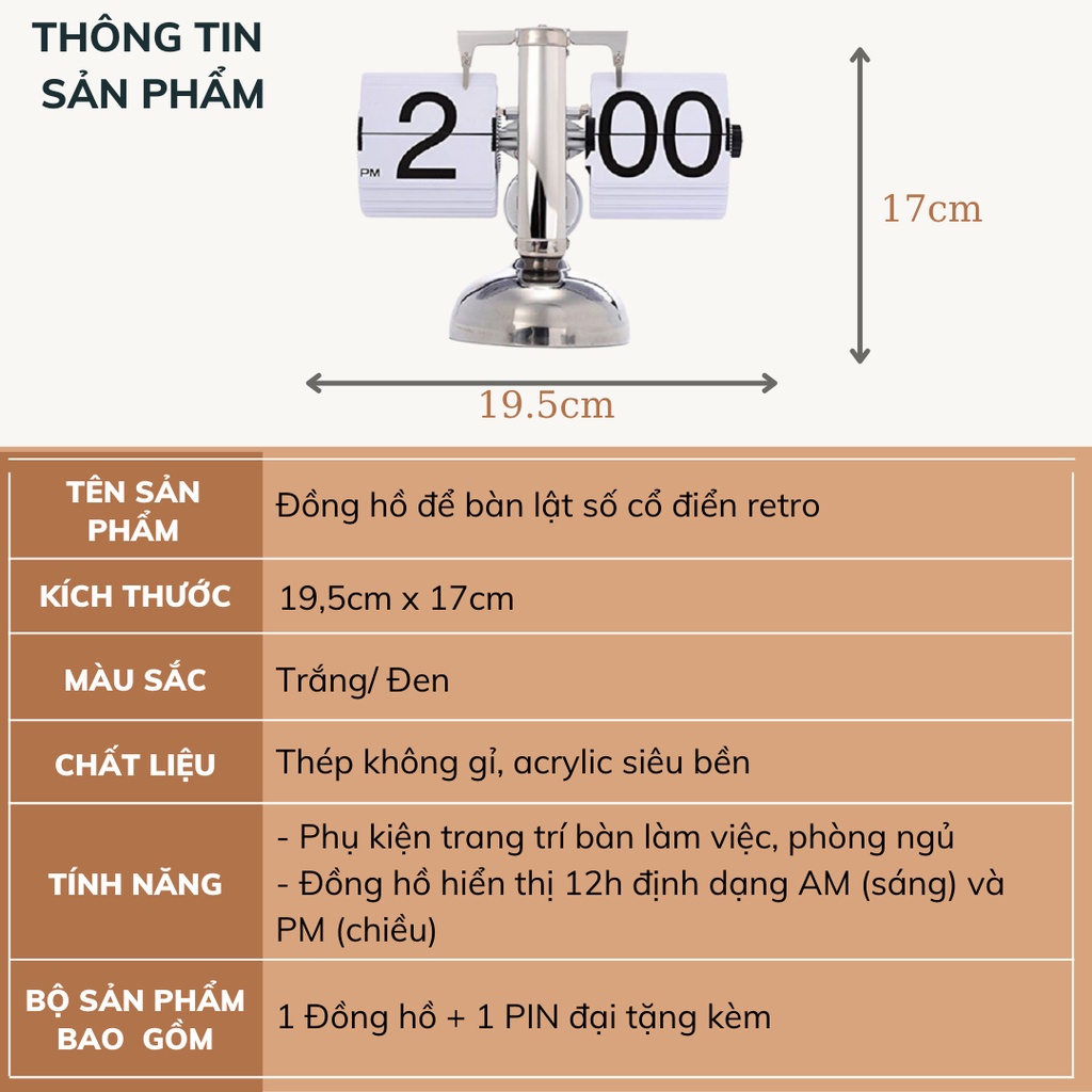 - Hiện nay, có rất nhiều loại ĐỒNG HỒ ĐỂ BÀN: đồng kim, đồng hồ số, đồng hồ đèn led,.. Vậy làm sao để có thể tạo điểm nhấn cho không gian nhà bạn. ĐỒNG HỒ LẬT SỐ PHONG CÁCH CỔ ĐIỂN sẽ giúp bạn làm điều đó. Sử dụng đơn giản, tuổi thọ cao, kiểu dáng độc đáo đáp ứng được mọi yêu cầu cơ bản của 1 chiếc đồng hồ.