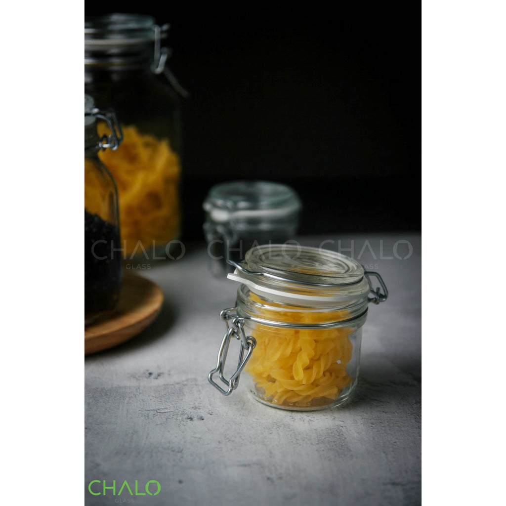 Nắp thủy tinh đi kèm có quai cài kim loại chắc chắn cùng lớp gioăng silicon đảm bảo kín khí tuyệt đối giúp gia vị & thức ăn của bạn luôn giữ đúng hương vị vốn có của nó.