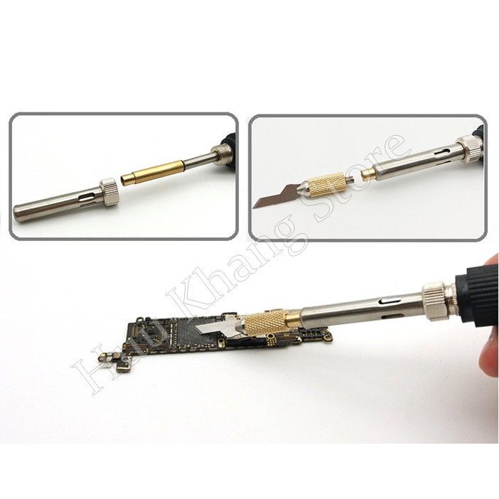 - Dùng gắn tay hàn 936 có thể gắn lưỡi dao số 4 để cạo keo, tách lưng, gắn lưỡi dao dài lấy film, ron...