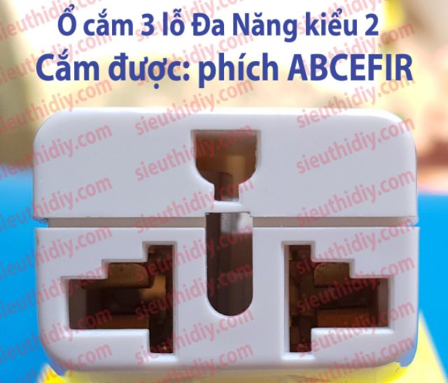 Phích chuyển 3 chân Mỹ,Nhật 1 tròn 2 dẹt song song ra ổ cắm đa năng:- Là một dạng phích cắm có 1 đầu như phích cắm 3 chân ( 1 tròn 2 dẹt song song ) chuẩn Mỹ, Nhật. Chuyển ra 1 Ổ cắm hoặc Chia ra 2-3 Ổ cắm Đa Năng có khả năng cắm được nhiều chuẩn phích cắm khác nhau ( xem hình các chuẩn phích cắm ).