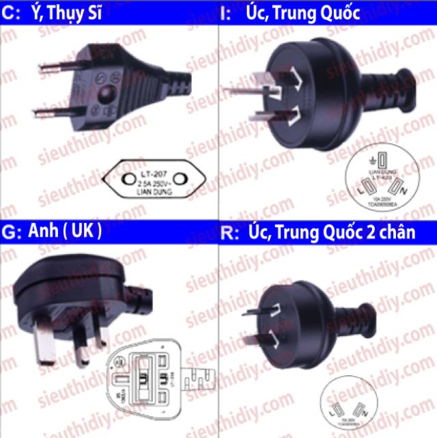 - Xem hình minh họa để biết mỗi loại Ổ Cắm Đa Năng hỗ trợ cắm được loại Phích cắm nào ( Phích cắm của thiết bị, máy móc mình muốn sử dụng ).