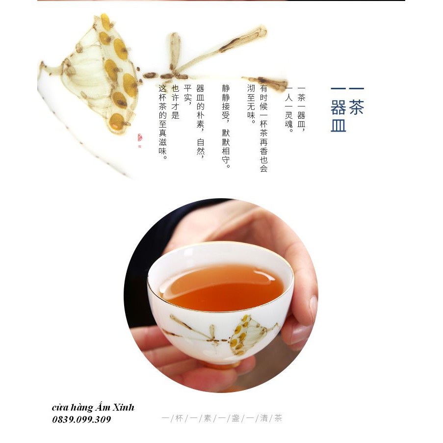 Trà" là men say của lữ khách " Hương" là trái tim của Trà. Trà với khách tương phùng. Chén sứ Cảnh Đức cao cấp, đây là món quà đặc biệt dành cho khách thưởng trà sành điệu nhất. - Trong lịch sử chén sứ Cảnh Đức chỉ dành cho vua chúa và quan lớn trong triều ngày xưa. Nó là biểu tượng của sự sang quý.