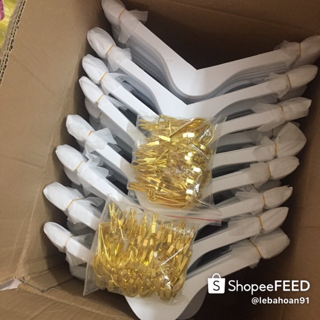 Nhà cửa & Đời sống > Sắp xếp nhà cửa > Mắc áo || móc gỗ treo quần áo Nam Nữ màu trắng đầu móc mạ vàng.Còn hàng