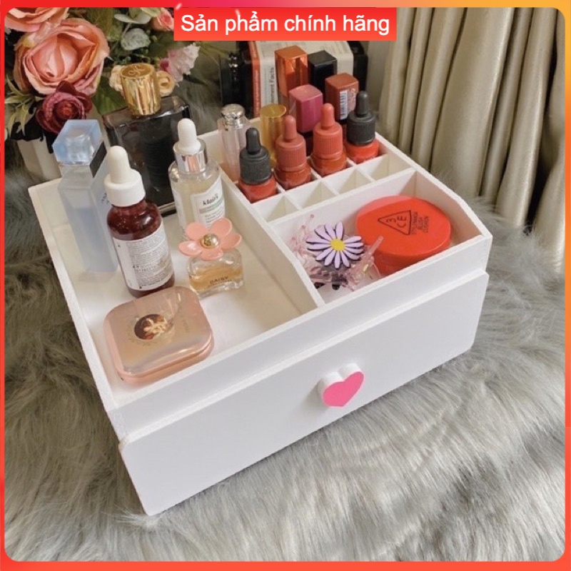 Kệ mỹ phẩm trắng tim hồng 25cm tiện dụng có khay đựng son 16 ô và ngăn kéo chống bụi