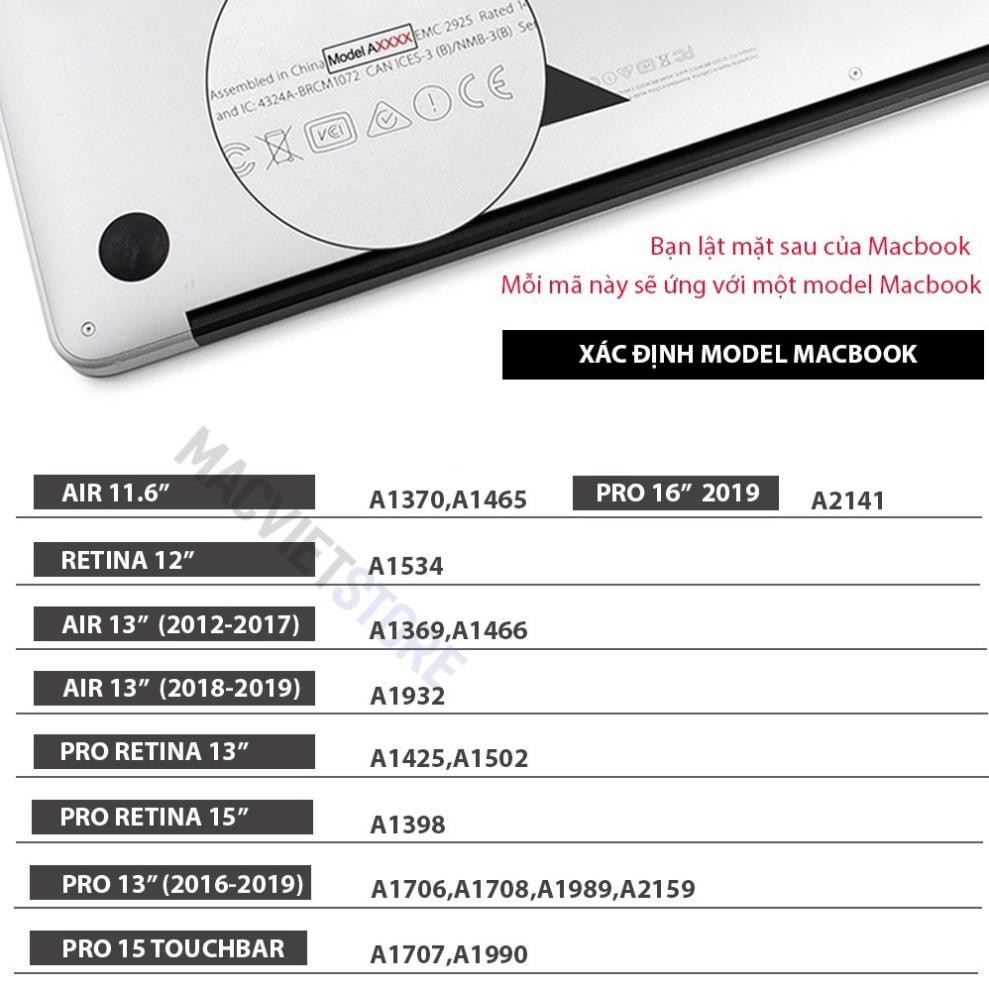 Bạn lật mặt sau của Macbook sẽ có ghi mã Model ( Trên ảnh sản phẩm shop có ảnh hướng dẫn). Bạn đối chiếu với bảng sau