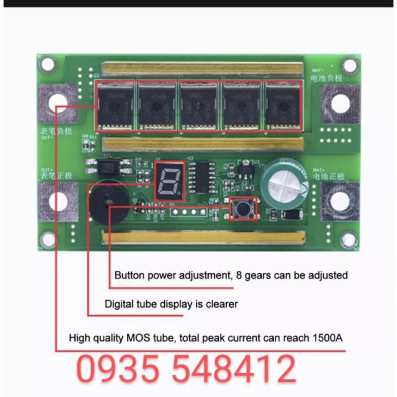 _ Có led báo cấp. ( 8 cấp độ hàn ), hàn được kẽm tối đa 0.2 nguồn cấp có hiệu suất cao ( vd acquy khô 35ah, pin lipo chuẩn 3s xả 70C, ...)