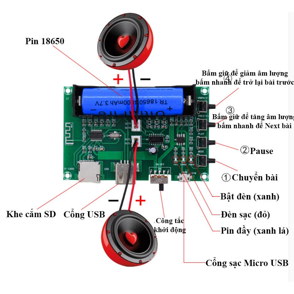 1. Lắp pin 18650, chú ý cực âm và cực dương, sản phẩm ko có sẵn pin