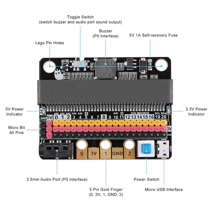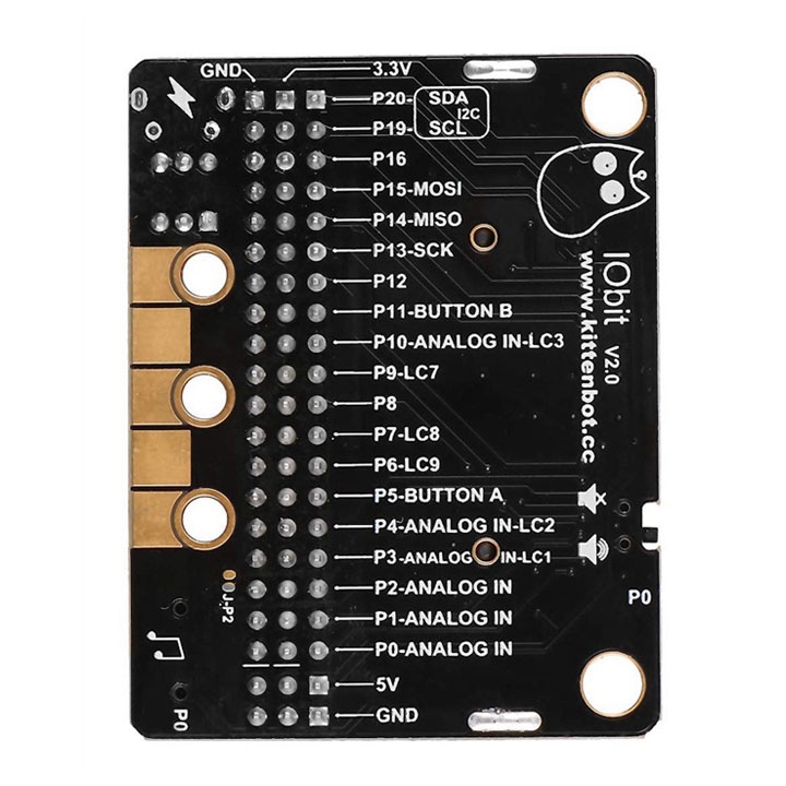 - Mạch Micro:bit IOBIT V2.0 được sử dụng để chuyển các phần chân kết nối IO của Micro:bit thành dạng Header đực chuẩn 2.54mm giúp dễ dàng kết nối với các loại dây cắm Breadboard và Breadboard để thực hiện các thí nghiệm, mạch tích hợp Buzzer và cổng xuất âm thanh 3.5mm cho phiên bản Micro:bit V1 ở chân P0, công tắc nguồn cũng như các chân các chân cấp nguồn 5VDC để cấp nguồn cho các module, cảm biến sử dụng 5VDC.