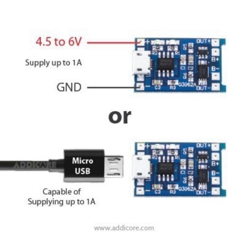 + Đầu sạc cổng MicroUSB + Có thêm chỗ hàn dây sạc (nếu như không muốn dùng cổng MicroUSB có sẵn) hoặc phối ghép nhiều mạch để sạc pin