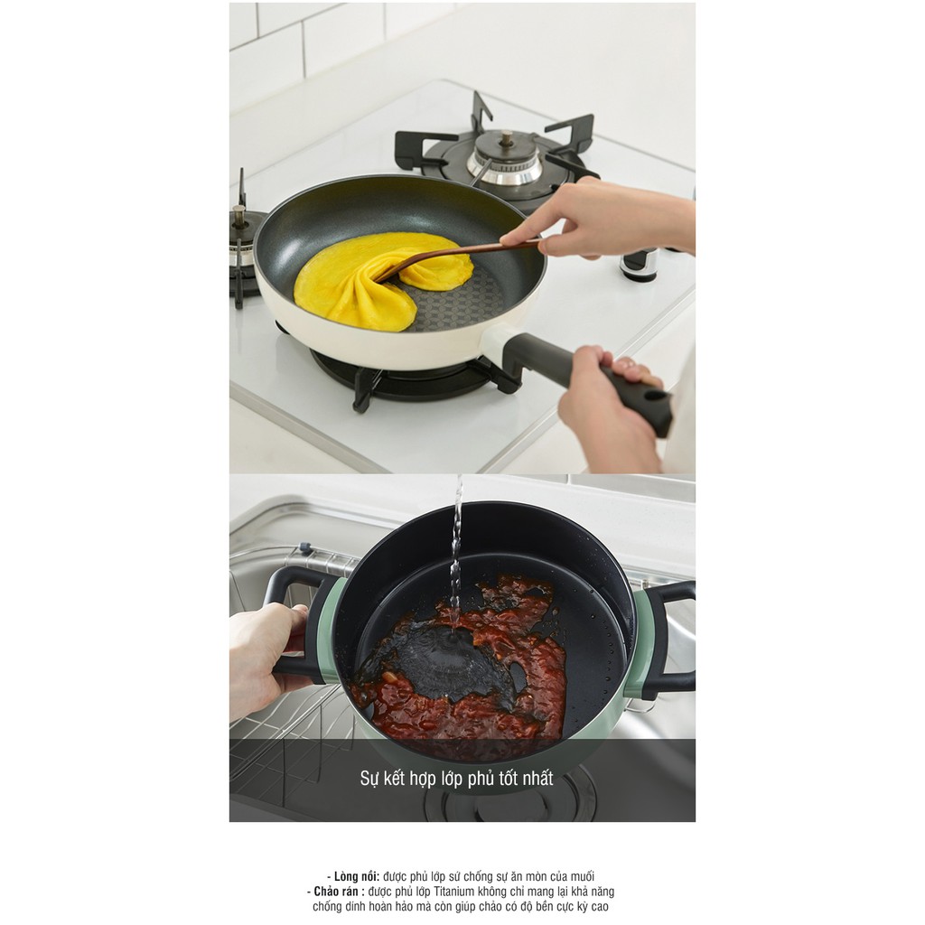 Chảo rán : được phủ lớp Titanium không chỉ mang lại khả năng chống dính hoàn hảo mà còn giúp chảo có độ bền cực kỳ cao