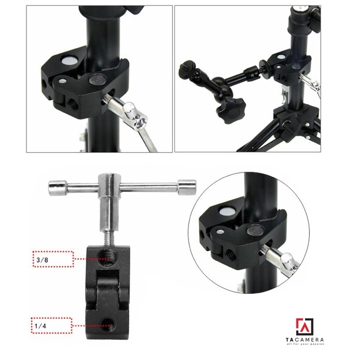 - Đầu khớp nối có thể tháo rời thành chuẩn ốc 1/4, chuẩn chân flash rất đa năng và thuận tiện.