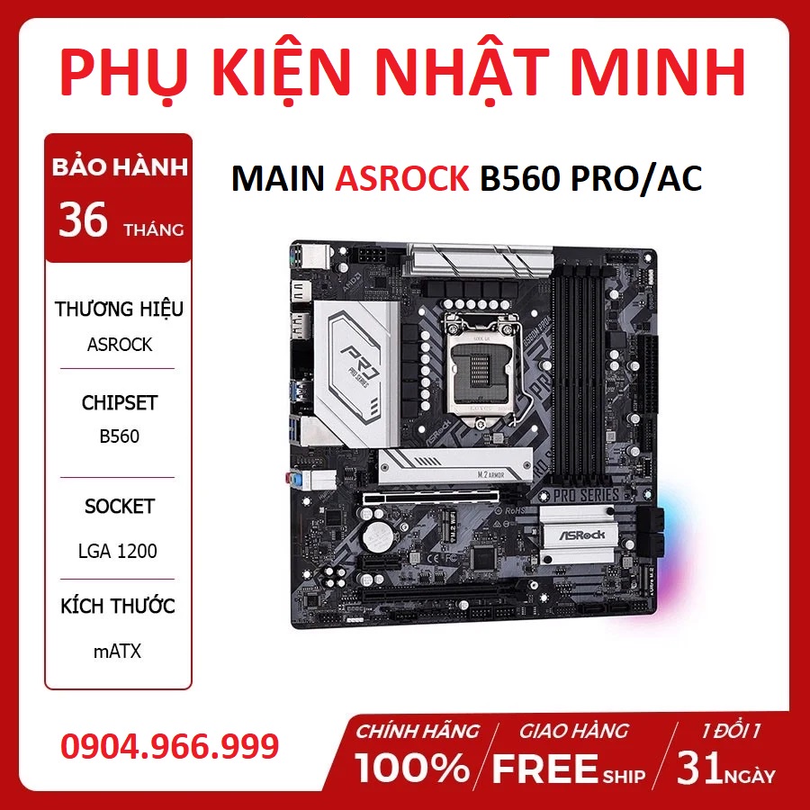 MAINBOARD ASROCK B560M PRO 4/AC (Intel B560, Socket 1200, m-ATX, 4 khe Ram DDR4) tích hợp wifi chính hãng BH 36 tháng
