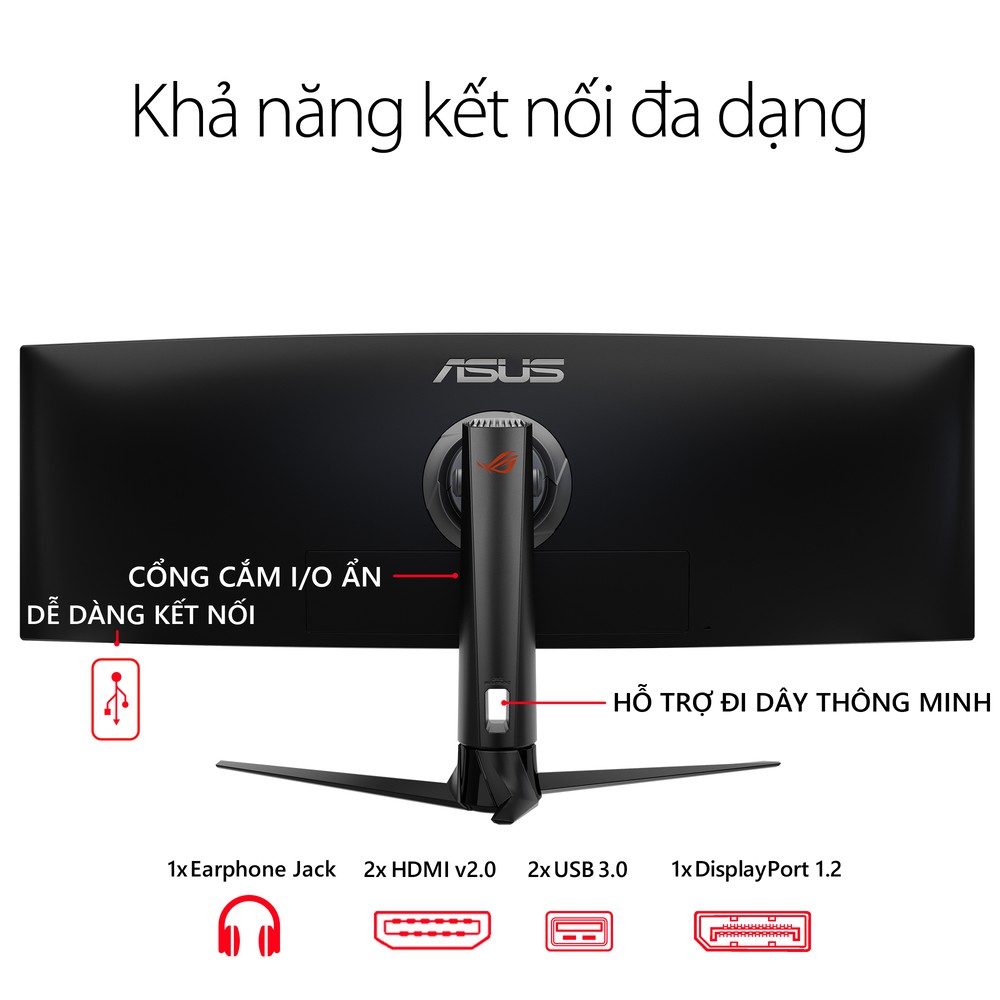 ROG Strix XG49VQ hỗ trợ lựa chọn đa dạng tùy chọn kết nối bao gồm DisplayPort 1.2, hai cổng HDMI và hai cổng USB 3.0.