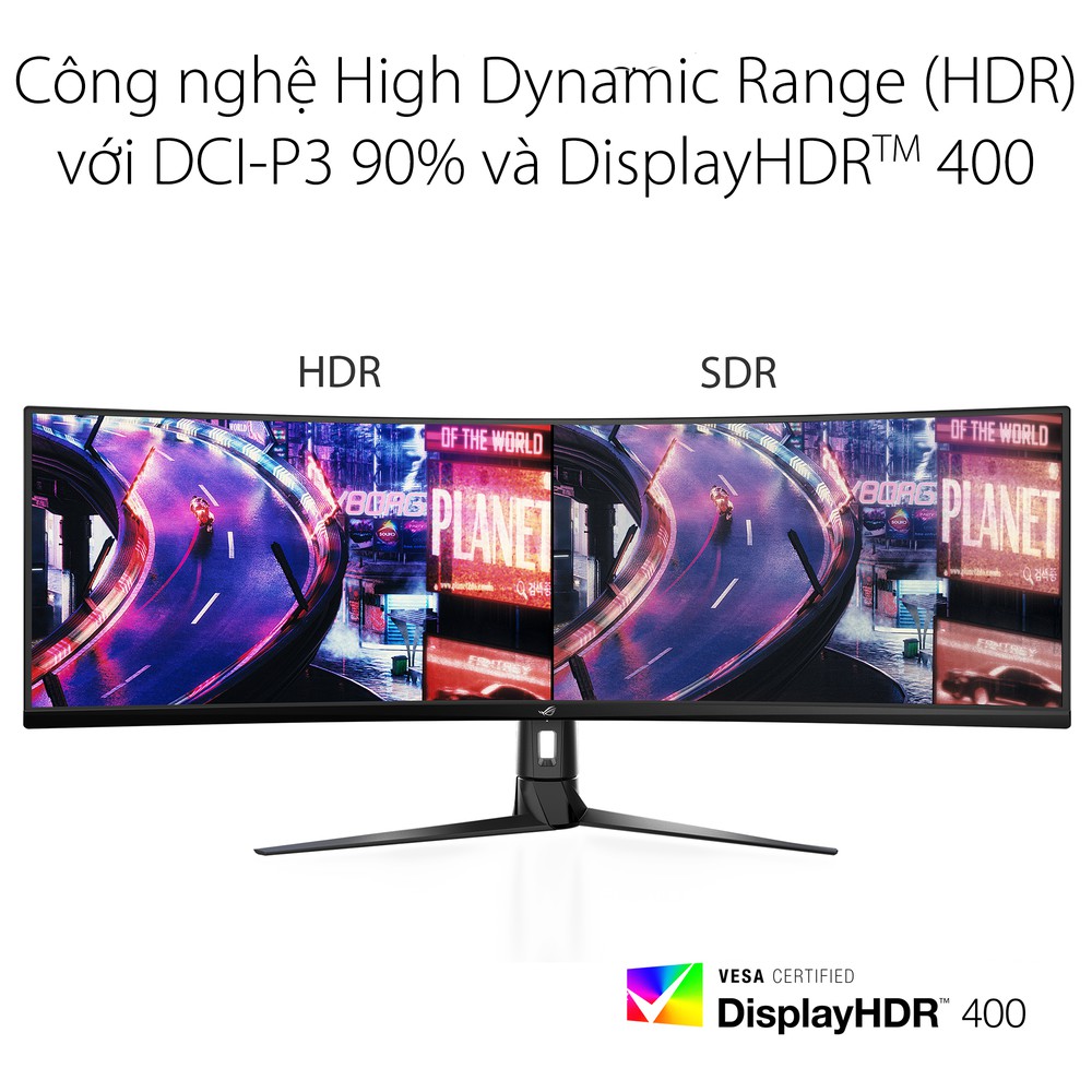 Để mang lại trải nghiệm HDR tốt nhất, ROG thử nghiệm từng màn hình trước khi xuất xưởng để đảm bảo sản phẩm đạt chuẩn DisplayHDR™ 400. Để đáp ứng tiêu chuẩn này, độ sáng cực đại của ROG Strix XG49VQ là 450 cd/m2, cao hơn 50% so với dải động tiêu chuẩn của các màn hình phổ biến. XG49VQ cũng mang đến gam màu DCI-P3 90% và hiệu suất tương phản.