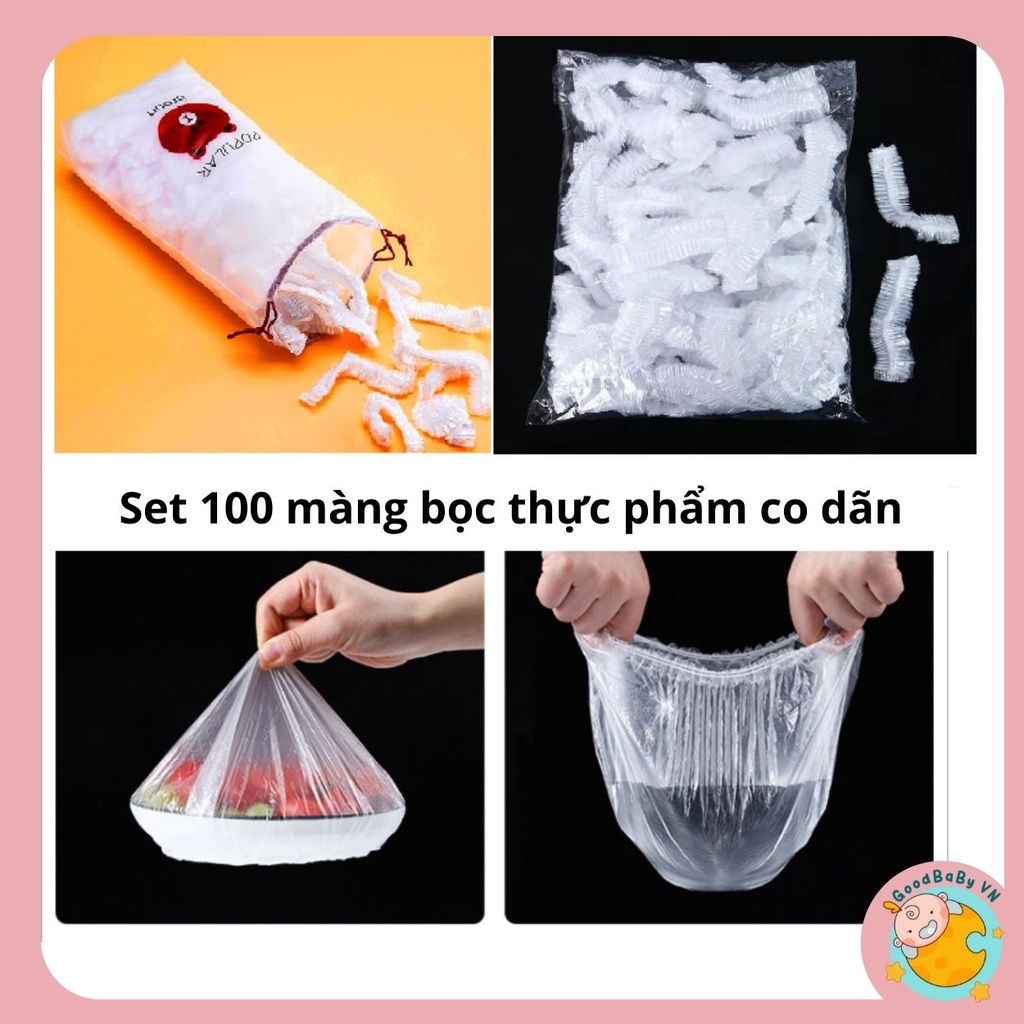 Màng bọc thực phẩm co giãn, siêu dai có chun an toàn kèm túi gấu set 100 chiếc GoodbabyvnLưu ý giúp bên e sản phẩm size lớn ,dai và bền không phải mã rẻ tiền dễ rách ạ