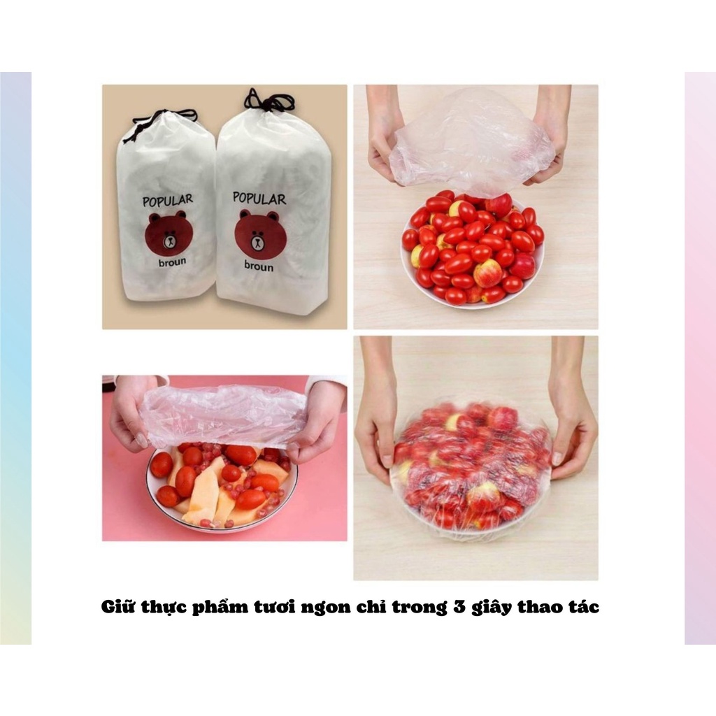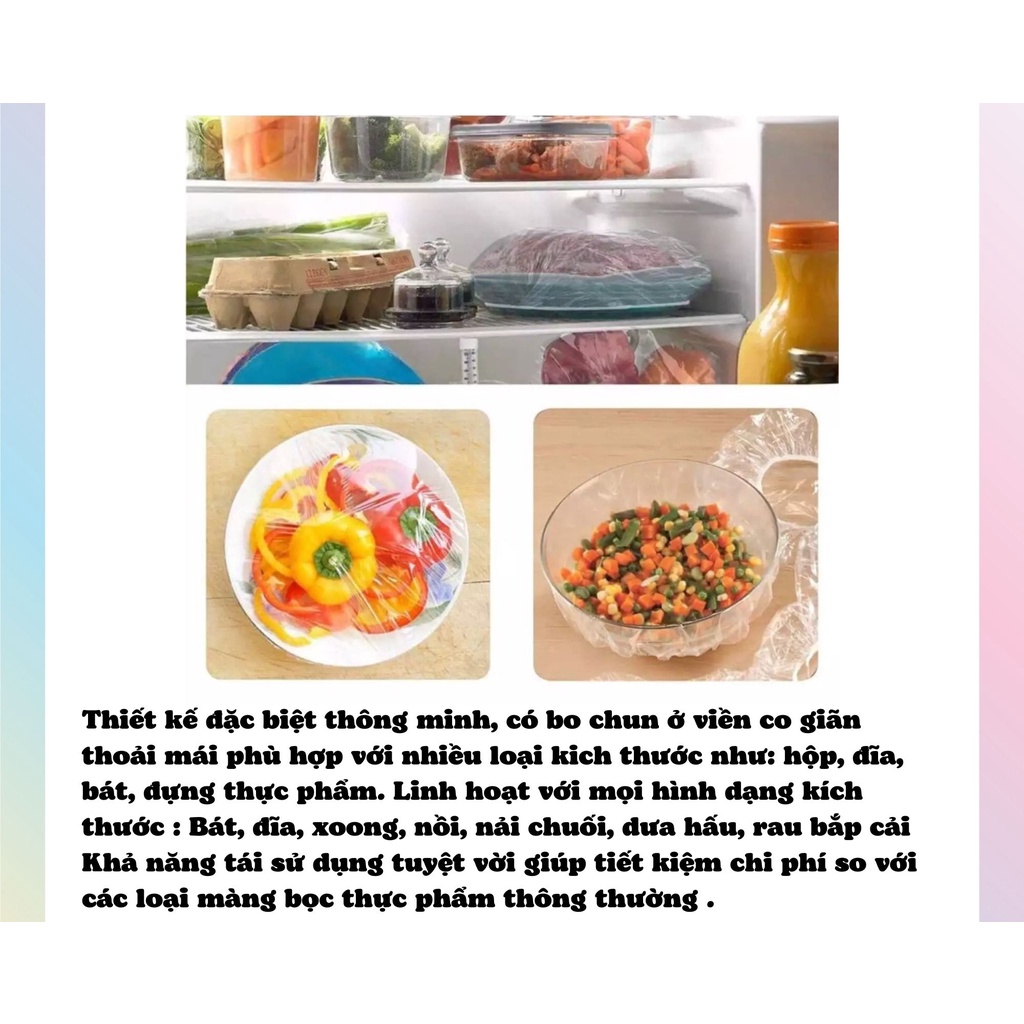 + Thiết kế đặc biệt thông minh, có bo chun ở viền co giãn thoải mái phù hợp với nhiều loại kich thước như: hộp, đĩa, bát,.. đựng thực phẩm.